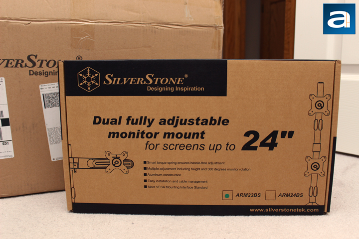 As you can see, the SilverStone ARM23BS' retail container is pretty standard for SilverStone, with a black and brown color scheme. The front shows a product description, with some feature points underneath. There are two drawings of two different mounts on the front, so you might wonder which is contained. However, the bottom right corner shows two models indicated by the model numbers. The ARM23BS is what we have today, and this holds two monitors in a horizontal configuration. The ARM24BS is made to stack monitors vertically. I should also note, SilverStone announced their ARM23BS-L, which horizontally holds monitors 24" and larger. Otherwise, a plastic handle can also be found at the top of the box to make carrying the box easier.