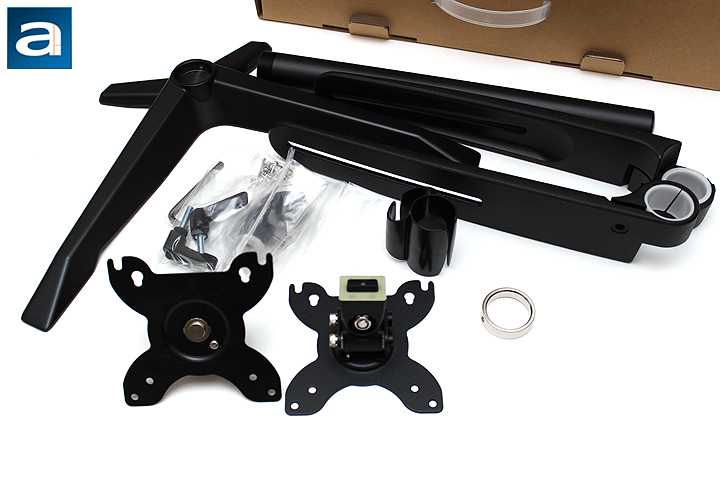 Out of the box, we have several things, most of which are for building the SilverStone ARM23BS. From the top, you can see the single X stand. Next to it is a pole and two horizontal arms. In the middle is a plastic clip, silver metal ring, and several plastic bags holding screws, tools, washers and more small pieces. Finally, the bottom two parts are the two monitor mounts, and you will see how they fit later on. All of these parts are held in the box with a huge Styrofoam bracket to prevent any surface scratches on the different parts. Styrofoam is adequate in this regards, but it can be annoying to deal with once it starts disintegrating in your hands. A manual is also included to help in putting all of this together.