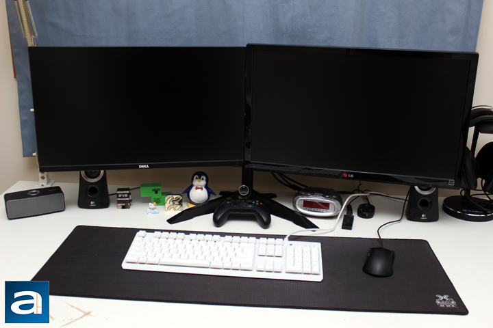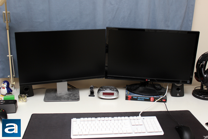 Before we do begin, above is an image of what my current setup looks like. As you can see, I have a Dell UltraSharp U2414H monitor on the left side, an LG 24EA53 on the right. From the photo, you can infer the LG monitor cannot be adjusted in height, as I have propped it up with a thick book. Personally, I have been looking for a monitor mount to clean up my desk and raise the heights of both monitors, but it has partially been my table that has held me back. As we have seen with desk-mounted arms, such as the ARCTIC Z2 Pro or SilverStone's own ARM Two SST-ARM22SC, particle board tables like mine are not strong enough to support a great deal of forces on a single point. As the SilverStone ARM23BS is not clamped to the table, but rather sits on the surface, this is not an issue.