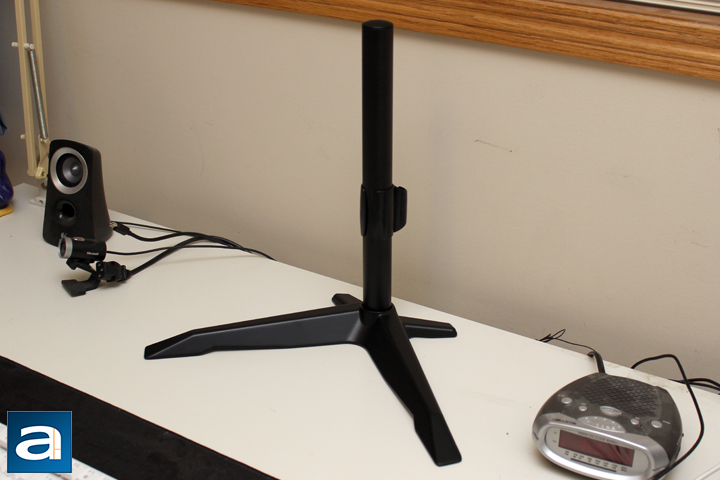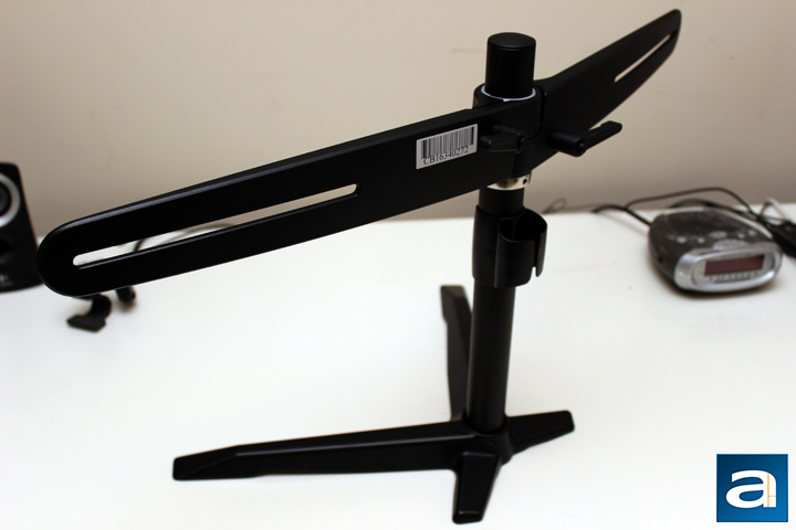 Starting from the bottom, you can begin by taking the black pole and screwing it into the bottom base. The X bottom has a hole with threads to screw the whole thing in. There was a bit of difficulty at first, as lining up the threads was not the easiest, but this predicament was solved by placing the base on a flat surface prior to mounting. The base has four rubber pads underneath. This should help prevent the base from scratching the surface it sits upon, while providing enough grip to prevent the base from sliding around. Obviously, the weight of the monitors will do this too. The base, as well as most of the other components, are black in color. It is covered in a gritty like surface, making it feel a bit more industrial. Next, you can slide the plastic holder around the vertical bar. This is actually used to help with cable management, as you can feed your connection and power cables through this loop to make for a cleaner finished product.