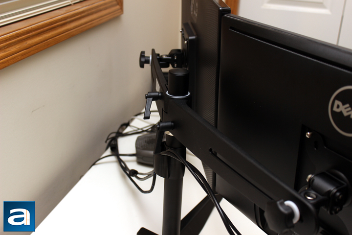 As everything is practically in place, the last steps in installation are quite minor. First, you will want to screw in the two knobs at the back, one for each arm. This tightens the arms so they do not swing so much and stay in place. It also ensures the arms stay at this height. The arms can be swung in and out to change the distance between each monitor, but majority of the adjustments will be done on the mount head itself. Finally, the last step is to cable manage everything into place. It would have been nice to see some cable routing paths instead of just a plastic bracket, but this is not a huge deal. I routed the Dell's DisplayPort, power cable, and the LG's HDMI cable through here. I would have done the same for the LG's power cable, but unfortunately, it was not long enough to take advantage of this path. I also threw on some Velcro straps around the cables to keep them together.