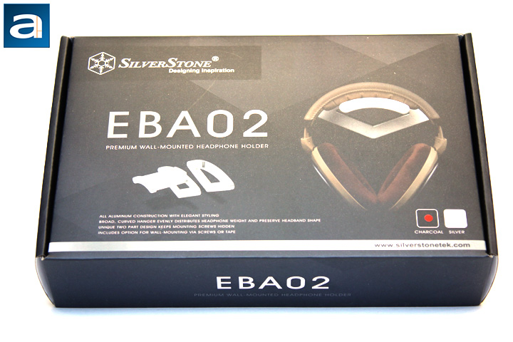 After pulling the review unit out of the shipping box, we can get a closer looker at the retail package. The overall design of the package is quite low key, since it does not have too many bright colors. Three colors, namely black, dark grey, and light grey, make up the major elements of the box. The background color of the whole front cover is black, but it is not just boring pure black. There are diamond shapes with lighter shades of grey color blocks showing to give the background a little bit of style. On the top left side, the SilverStone company logo, name, and motto are printed in white and highlighted in a black block. The product's model name is printed in the middle left of the front cover. At the lower left, we can see a picture of the product. The picture does not only show how the EBA02 looks, it also explains to us the headphone holder has two detachable pieces. As for the reasons of using two detachable parts, they can be found in the descriptions below the product picture, which I will get back to it later. On the right side of the front cover, the product's application scenario picture is shown. In this picture, there is a headphone comfortably resting on the hanger of EBA02. Below the picture, the color of the exact product in the box is presented. This time, we got the charcoal colored headphone hanger in the box, although the two pictures demonstrate a silver one. Generally speaking, the retail package design does its job. By just glancing at the package shortly, customers can easily capture the overall design of the product.