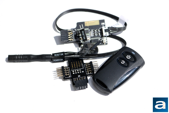 SilverStone was nice enough to include a small screwdriver for the remote, as well as a ninety degree adapter if your motherboard has some hard to reach connectors. The important piece of the SilverStone ES02-USB is the small board at the top of the picture. One end of it connects into a USB 2.0 port on the motherboard, while the other end has the power and reset connectors on a small cable. I will talk a little more about the installation process after the next picture. This little adapter plugs into the USB 2.0 slot, and then has three different sets of pins going in different directions to make it slightly easier to connect.