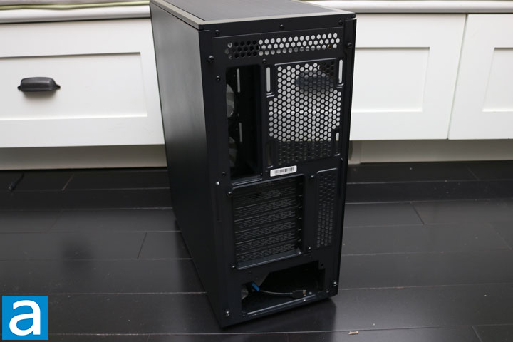 The SilverStone FARA 512Z is a familiar look for the most part. The back has the usual motherboard cutout with a fan exhaust next to it. A 120mm fan can be mounted here, but one is not included with the case. If you are eagle-eyed, this is where you may find a unique feature to the FARA 512Z. The seven expansion slots can be completely removed and reinstalled in a vertical orientation. There are four outer screws to allow the user to remove the entire square area of the slots and reinstall them easily in a different orientation. This is a fun added feature with a clever design choice to make the case more flexible for your needs. Below the expansion slots, we find the power supply cutout. This is a cutout for a standard ATX power supply. The right back panel shown above is made out of steel, while the left side panel is tempered glass.