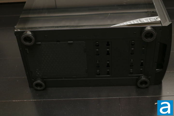 The bottom of the SilverStone FARA 512Z keeps its standard layout. There are four circular feet, which keeps the case lifted about 2cm off of the ground. This allows the power supply to function as an air intake. There is a small dust filter located down here, which will help keep the internals clean. The dust filter is not on rails and without a frame, so it can easily be lifted out, but it is a bit more work to slot it back in. The four circular feet also have rubber on the bottom. These help to keep the case in place and prevent any damage to whatever the case is sitting on.