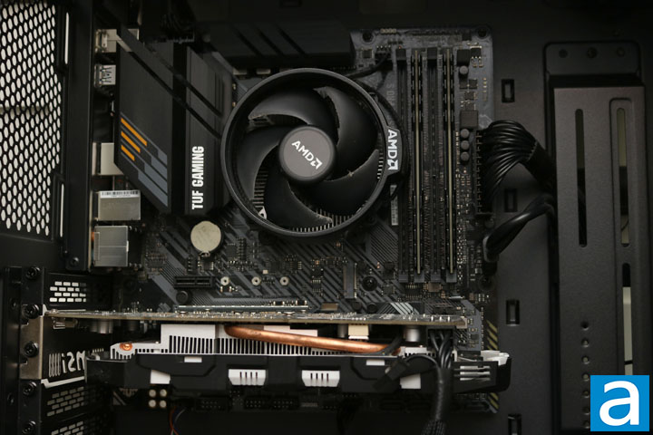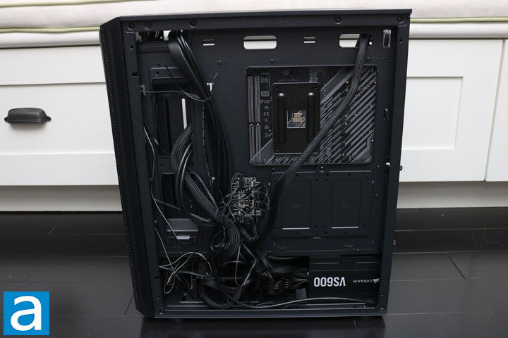 Afterwards, I installed the motherboard and plugged in all the required cables. All the required standoffs are preinstalled for an ATX motherboard. There are cutouts on top of the power supply shroud, which help to route the front I/O connectors to the motherboard. Towards the side of the 24-pin connector, there is a large opening that spans the entirety of the motherboard. You can use this for SATA cables and the front USB header, as the cables are mostly hidden. A graphics card support bracket can be mounted in the cable routing channel to help prevent a card from sagging, but I did not end up using it.