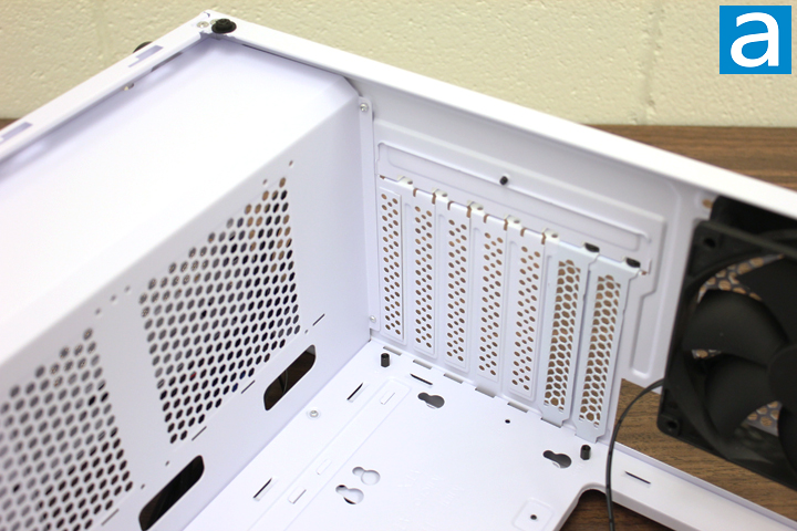 As a mid-tower that pushes the size envelope, the SilverStone FARA R1 can support ATX sized motherboards and, of course, smaller boards such as micro ATX and mini ITX. All motherboard risers were screwed on to the tray from the factory. Users do not need to apply the required risers according to the size of motherboard that will be used. After bolting the motherboard into position, the heatsink or water cooler block can then be easily installed and removed, thanks to the big rectangular opening on the tray. From the above photo, you can see there is a 120 mm fan from the factory on the case’s rear exhaust opening. If the user wants to use a closed loop water cooler system, it requires an extra step to install the radiator directly onto the chassis, which is to remove the preinstalled fan. The expansion slot covers of this chassis feature slotted holes to allow better ventilation, but I would prefer for it to be a solid piece for better dust prevention, since I really doubt it makes a significant difference to just have several small holes here.
