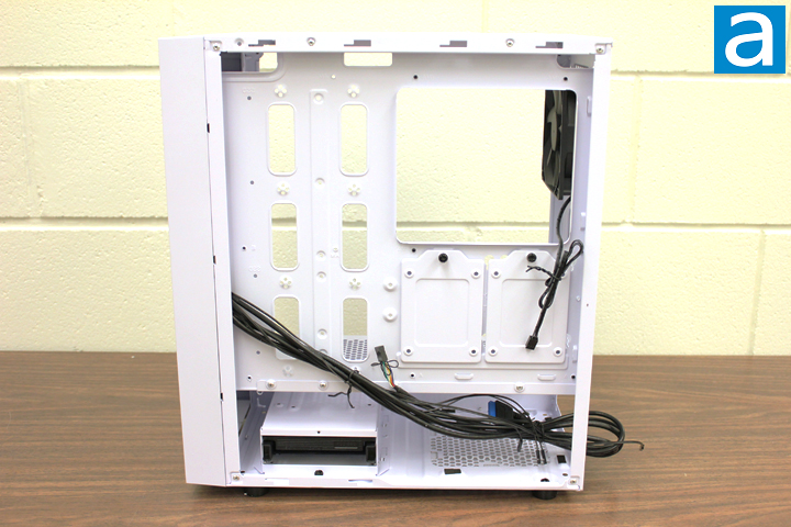 Upon removing the right side panel, you will see the other side of the basement chamber and the motherboard tray. An internal drive cage that can hold one 3.5" HDD and one 2.5" HDD is located to the left side of the power supply area for easy installing and removing of the hard drives. If you do not want to install any drives in the power supply chamber, the cage can be removed by unscrewing the thumbscrews. As you can see from the above photo, two 2.5" drives can be installed on the motherboard tray. Regarding cable management, the FARA R1 did an alright job here. Between the motherboard tray and the right side panel, the room for cable routing is about 15 mm, which is a bit tight for some thicker cables. In the above picture, zip-tie mounting holes are present on the motherboard tray, which can provide for better cable management. Meanwhile, there are six long openings to route the cables.