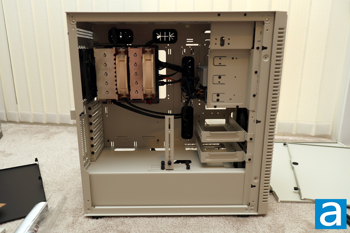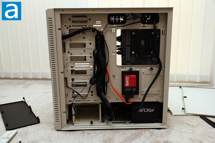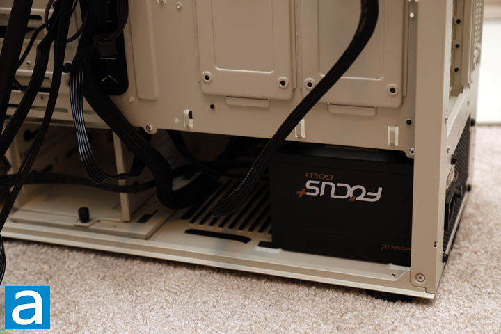 Starting on the back, I installed my power supply, a Seasonic FOCUS Plus 850 Gold 850W in place. This unit measures 14.0cm in length. With the drive cage installed, SilverStone indicates a clearance of approximately 25.0cm for the power supply and its cables. This should be sufficient for most PSUs, but you can always take away the drive cage if you do not need it. Next, I led the necessary cables for my system through the rest of case.