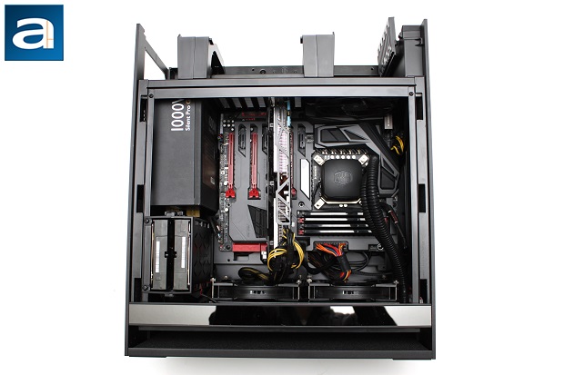 First and foremost, I installed my power supply, routing all necessary power and connector cables to the appropriate areas. Having no optical drives, I used that particular area as a tool for managing my cables on the back side. For those that intend to use a closed loop water cooling unit such like me, that would come in next. For your reference, I managed to stick in the Cooler Master Nepton 280L. This will probably be the biggest unit any end user will want to use in the Fortress FT05, especially if you consider making use of the 3.5" hard drive rack, as there is minimal gap between the radiator and the rack. Last but not least, the video card and the hard drive rack will be installed. Those who have a longer video card will be forced to use only two fans on a slim radiator, as there is almost no clearance room for such configurations, unless the video card is shorter.