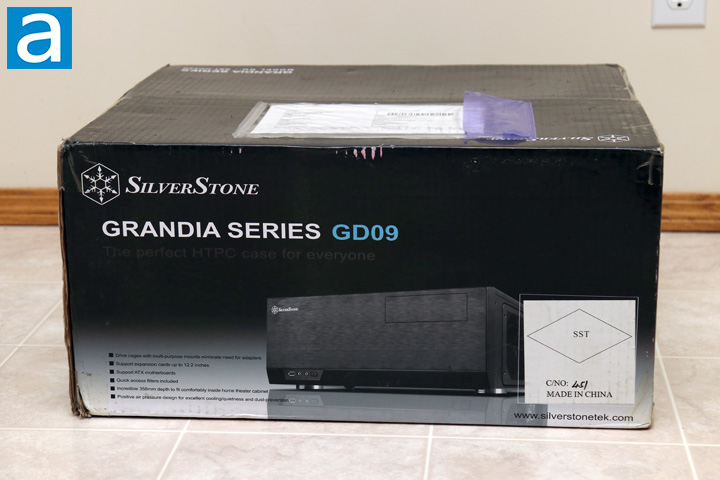 Today's review unit of the SilverStone Grandia GD09-C arrived from SilverStone's offices in Chino, California. Traveling with UPS and their Standard ground service, this box arrived in generally good condition. As you can tell from the photo, the retail container doubled as the shipping container. The retail container is a bit fancier than what I am accustomed to with colored printing and many images for a fancy look.