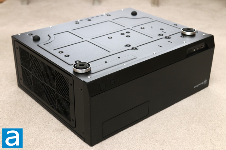 Flipping the case over, you can see the right side has a single removable plastic fan filter. This is, once again, held by plastic tabs and covers two fan slots. On both of the sides, you can see two screw holes near the front. This provides the ability to mount the Grandia GD09-C on to a server rack. You will need to purchase the handles separately from SilverStone. At the bottom of the Grandia GD09-C, there are four feet. The front feature plastic feet with a large base and a foam ring to cushion the enclosure on top of its resting surface. These feet are silver and look like the feet you would find on the aforementioned audio/video receivers, and they function well in providing stability. The back two feet are smaller rubber bumps that will serve the same function. Otherwise, there is not much else at the bottom of the SilverStone Grandia GD09-C.