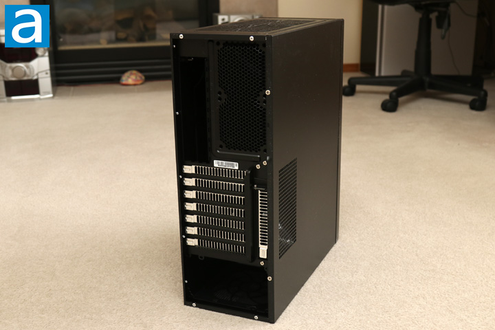 At the back, we have a pretty traditional layout when the SilverStone Grandia GD09-C is standing on the side. At the top of this image, we have the opening for the motherboard and two openings for 80mm fans. Underneath, we have seven expansion slots covered with silver expansion slot covers. This is probably more slots than you might expect for the GD09-C's purpose and size, but the reason behind this will become clearer later on. We also have a single slot that is perpendicular to the rest. Otherwise, you can see there are perforations near the expansion slots to increase the airflow around any expansion card you may put here. Finally, at the bottom of this image, we have a large opening that perfectly fits a standard ATX power supply. Despite this smaller form factor, it is nice to see SilverStone support the ATX standard rather than forcing users to buy an SFX or SFX-L unit instead. Otherwise, it is time to crack the SilverStone Grandia GD09-C open to get a better look inside.