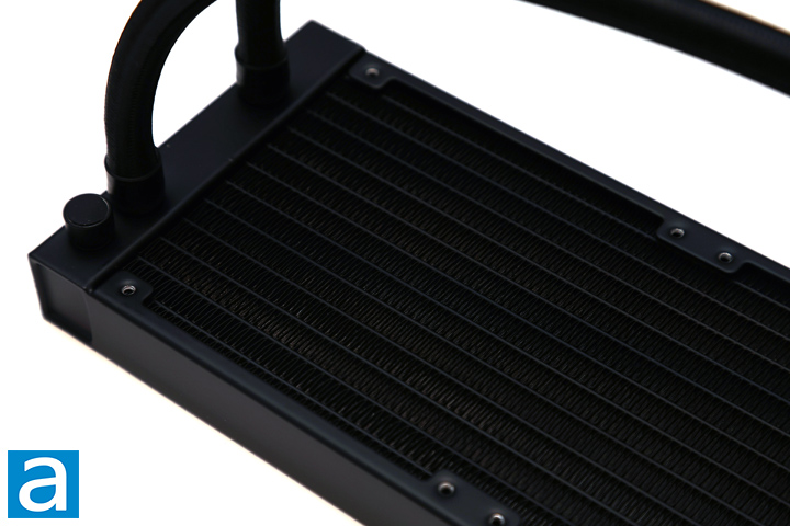 The radiator measures 396mm long, 120mm wide, and 25mm thick. These are within typical dimensions for a 360mm all-in-one liquid cooler. This size plays a significant role in cooling, as a larger surface area will result in better heat dissipation. The radiator is made out of aluminum, which offers decent heat transfer qualities. However, the primary advantage of using aluminum is its low mass, which should reduce the strain placed on the case where this is mounted. Looking at the whole package, the build quality on the SilverStone IceMyst 360 is excellent. There are no defects or nicks on the radiator or on the tubing around it. In order to protect the fins and area underneath the mounting holes, SilverStone has accommodated the extended mounting screws by spreading out the fins and creating a cavity here. Due to this, I do not believe the included screws will damage the radiator, even if you over-tighten it.