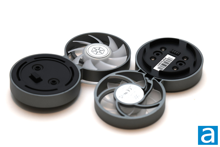 As mentioned, SilverStone sent us two sets of their IMF70-ARGB fans. From this view, you can see both sides of the fans. They are intended to only install one way and blow air towards your motherboard components. We have seen something similar on other coolers like the CRYORIG A80, and more recently with the ARCTIC Liquid Freezer II 280 A-RGB. The idea is to provide a bit of cooling for components near the processor. While the concept is not new, the innovation is the fact you can add multiple and move them around as you need. You can also rearrange them to cool other components around the processor socket. As for the IMF70-ARGB, these slot into the top of the water pump block and can be secured further with plastic pins. Of course, the four curved slits and protrusions help with securing them in place. The aforementioned 8-pin header is used for controlling the lighting and fan speed. Once installed, the fan module can rotate for a total of 320-degrees. SilverStone has not specified a maximum number of fans you can stack on top of each other, although I would expect diminishing returns after a certain number, as they would stack too far above your motherboard.
