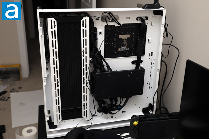 The next step is to install the fans on the radiator. With the three-in-one header and connection cable, I mounted the fans with the daisy-chain cable attached. While you could plug the cable in after the fact, it is a bit tight in the corners. Next, you can mount the radiator to the case. Afterwards, apply enough thermal paste, which is included from SilverStone, and install the water block and pump combination on top of the processor. Be sure to remove the protective label on the bottom of the block. When mounting, you should secure the whole block in a cross pattern to ensure even pressure and bolt tightness is applied. Finally, connect everything to the necessary headers. If you need to, you can also use the additional addressable RGB lighting control unit. Otherwise, I was able to finish the installation without any issues.