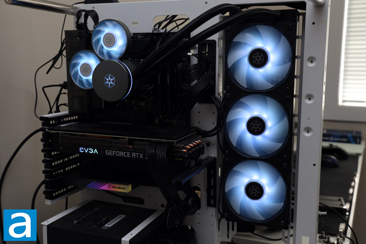 As for the added SilverStone IMF70-ARGB fan modules on top of the CPU combination block, we took surface temperatures of the motherboard near the VRMs and the surrounding area. Without the fans, I measured temperatures around 43c. However, with a fan over the area, this reduced to 40c. I also tested this with the fan pointed at my XPG Atom 30 1TB SSD while running some benchmarks, but the measured peak temperatures from the drive were the same with or without the fan. As such, you can see the fans provide some airflow, and its benefits are clearly seen with hotter components near the processor.