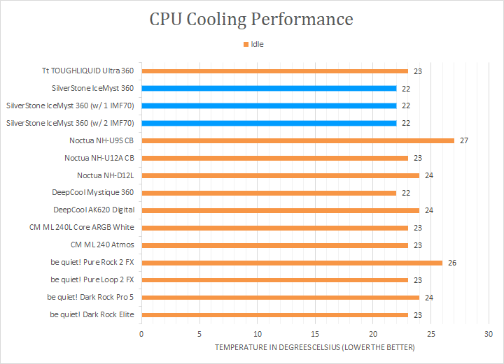 After letting my computer sit idle for a while, I checked the temperature of the processor. From the first graph, you can see the SilverStone IceMyst 360 idled at a temperature of 22c. This was among the coolest results, which is great to see. However, idle numbers do not give a full representation of what CPU coolers can do, so we started up the Prime95 tests to see the more pertinent results.