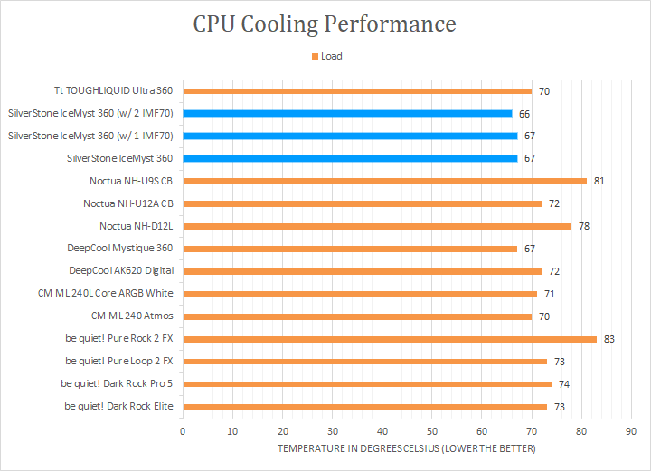 As for the sound analysis section, on a scale of 0 to 10 where 0 is silence and 10 is very loud, I would rate the SilverStone IceMyst 360 at around 5.5/10 under full load and a 4.0/10 idling. When you add the two additional IMF70-ARGB fans, this also adds to the total noise output, increasing this to 6.0/10. For me, the real surprise was the sound output under less demanding loads. While liquid coolers have more moving parts than air coolers, I think there could have been some improvements in this area. One good point is that this noise was constant so it blended into the background after a while.