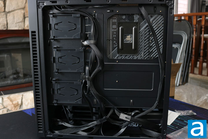 The back of the case has 25mm room of space for cables. Most of the cable management capabilities is present to ensure all the cables get tied down well. There are plenty of loops to tie each cable down. With the drive cages down below, it does limit how much room is present to keep cables tucked away. Particularly, if you have a longer PSU, it will be more of a challenge to keep the cables tucked away properly. As mentioned previously, the rubber grommets, unfortunately, can be easily pushed out, and the front I/O cables are not long enough to be properly routed through the basement cover. Overall, the cable management capabilities are adequate, but there is room for improvement.