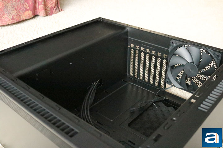 The power supply cover does not have any holes, which helps to keep the two temperature zones separate. The cover is also completely black with no other markings; not even a logo. From this view, the cable management hole for the motherboard connectors can be seen. It is a little small, and during installation I had some trouble reaching to the far end of the motherboard using that hole. Particularly for the HD Audio connector, I was not able to route it through the bottom cable management area. Luckily, the case does not have a window, which would reveal my lackluster attempt at cable management in the front. There are seven expansion slots, with an interesting mechanism to remove them. There are two screws that can be removed on the rear of the case, allowing a panel to slide out, which holds the covers in place. The two screws were really tight from the factory, and I almost stripped them when I was trying to remove them. The annoying part of this system is that all the slots can fall out once the panel is removed, and it is difficult to replace the panel, while stopping the other covers from falling out.