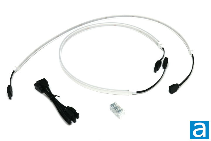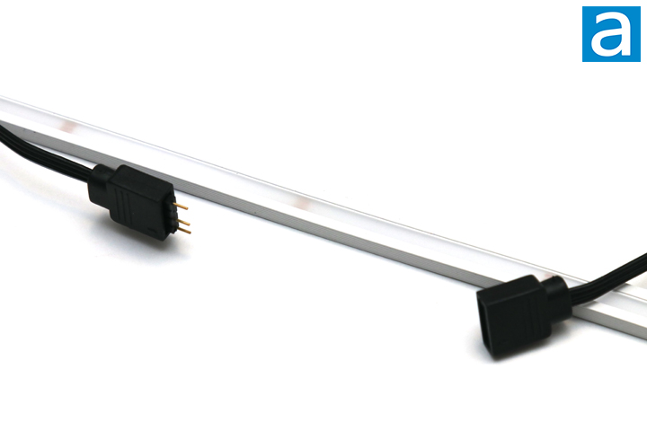 Two things that make the SilverStone LS04 stand out from competition are its LEDs and universal support. For the LEDs, you cannot really tell where exactly each LED is located on the strip when it is not powered on. SilverStone has jammed forty 2020 addressable RGB LEDs in a 45cm strip. The "2020" specification does not refer to the year these LEDs were manufactured, but rather the size of these LEDs, which is a small 2mm by 2mm size. As for the strip itself, this white strip acts as a diffuser for the many lights to spread the illumination evenly. It has one main gap on the top of the strip as well as on one side of the strip to allow the light to shine through, while other parts of the strip are covered in an opaque white. The strip itself is quite flexible and bends about with little resistance. As for the universal support, the plugs on the ends of the SilverStone LS04 are the addressable RGB three-pin, 5V plug. This differs from the older RGB pinout, which utilized four pins and a 12V output. It is great to see this standard addressable header used here, as most modern motherboards support this header. This should translate into users plugging these strips directly into their motherboard. As each strip has both a male and female end, you can daisy chain these strips together, though be sure you have enough power to chain all of these lights in a single line.