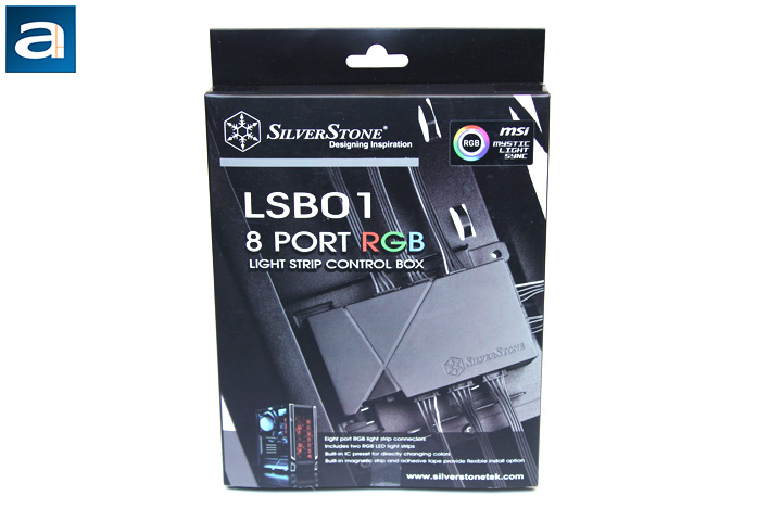 After pulling the review unit out of the shipping box, we can get a closer looker at the retail package. The overall design of the package has nothing to do with low key or stealth. The product picture was taken in a working scenario; where it was already mounted in a computer case. Comparing with just showing the product itself, the picture on the retail package is better, since it shows how capable of the LSB01 in terms of connecting RGB strips. In the picture, we can see eight RGB strips are connected by the LSB01 controller box. If you have not noticed how many RGB strips are connected, that is fine, because "8 port RGB" was clearly printed on the package right below the product's name. The company name, SilverStone, and the logo are located on top of the front cover. At the bottom, a SilverStone computer case is shown. I assume the computer case is illuminated by the SilverStone's own RGB strips connected by the LSB01. Frankly speaking, I cannot see if there is an LSB01 in there just by looking at the picture, haha. On the right side of the photo of the PC, features such as the eight port connectors, two included RGB LED strips, built-in IC, and built-in magnetic strip and adhesive tape of this product are listed. Generally speaking, the retail package design does its job. By just glancing at the package shortly, customers can easily find the most important information about this product, the number of ports available for the RGB LED strips.