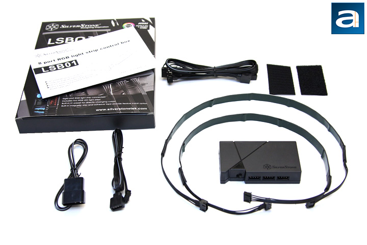Unboxing the LSB01 is really easy. You just need to slide out the plastic container and everything in the retail packet should pop out. In order to keep the internal flexible circuit of the RGB strips from breaking down, the two SilverStone LS02 RGB strips are rolled into a loop instead of being folded. The controller box is surrounded by the strips, and is restrained by the plastic container. A power cable is provided to allow the connection between the Molex connector and the controller box. If your motherboard has RGB 4-pin connector, the provided signal cable can be used to connect the motherboard and the SilverStone's proprietary 4-pin RGB connector. An extension Y cable is also packed in the box to allow longer reach of an RGB device. As for the installation of the control box, a set of adhesive Velcro tape is provided. Basically, everything you need to illuminate your computer case are provided in the package.