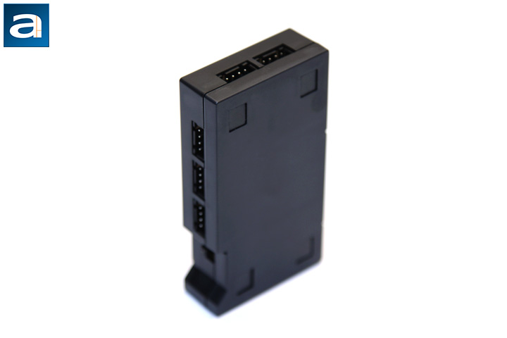 If your motherboard has an RGB 4-pin connector, the LSB01 is only a connector with eight more ports, and the signal is broadcasted to all of eight ports such that all the connected RGB devices are synchronized. However, if your motherboard does not have an RGB signal output, you will need to use the reset button on your computer case to change RGB settings. In my case, I need to use the "Reset" button on my computer to realize the RGB color control. From the above picture, we can see there are two 2-pin ports on the front surface. The left port is for the reset button connection, and the right port is for the power cable. I will need to leave the port in the middle empty, since I do not have any sort of RGB signal output from my motherboard.