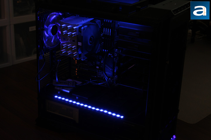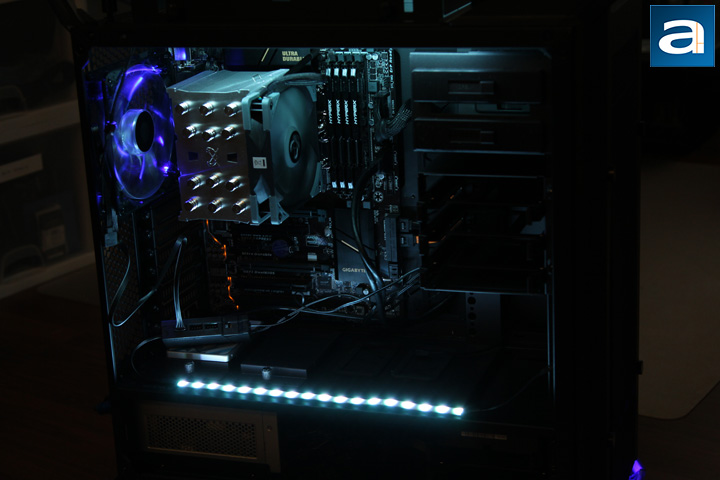 To install the LSB01 and the two included RGB strips and make them work are easy tasks. Everything is ready to go just by connecting some cables. I have an all-steel chassis, so no adhesive tape is needed. However, it may take you some time to figure out an optimum way to mount everything. For me, the optimum way means the RGB strips and the controller box are hidden behind the computer case panels. This is because I just want to show the components through the window, and it is better to not see the bright RGB strips directly. On the other hand, even though the LSB01 controller box features a pretty stylish design, I want to hide it as well, since the connected cables look pretty messy to me. Think about that, if you have all eight ports connected with RGB devices, you definitely want to hide those cables, and you can mount the controller box behind the motherboard tray. In my case, I just put the controller box on top of the PSU, since I only have two RGB strips.