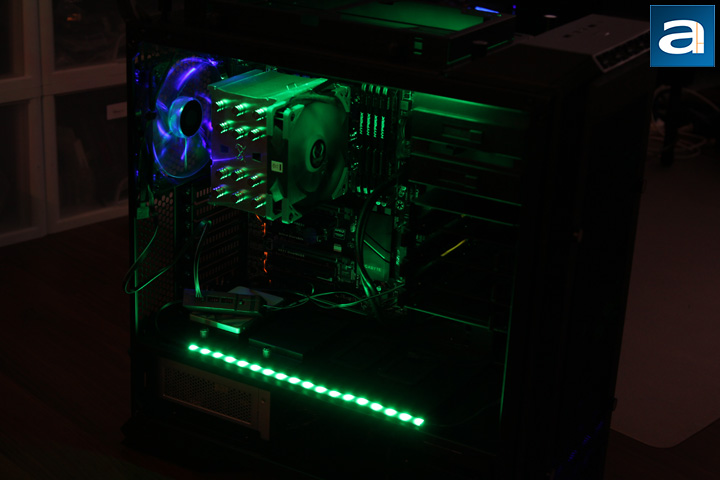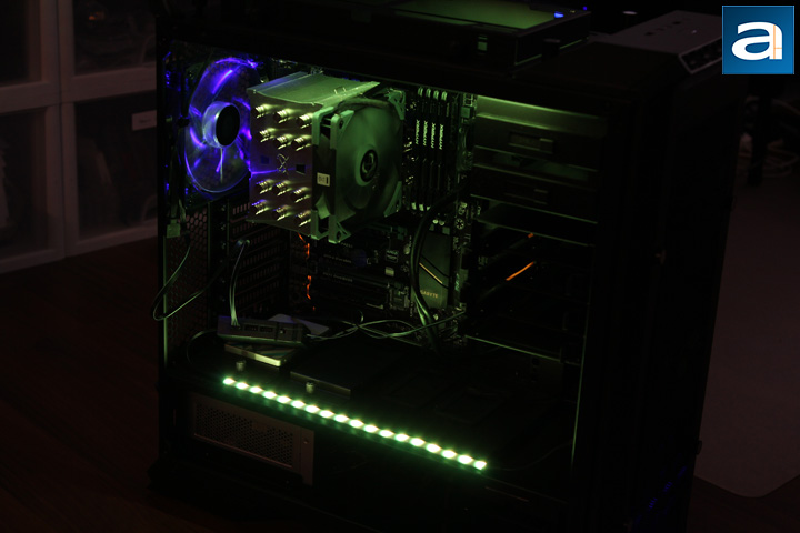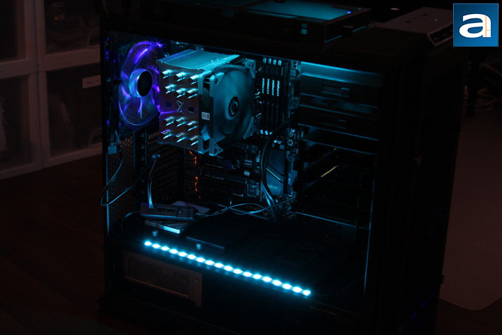 Installation of the LSB01 and LS02 RGB strips were very straightforward. In my case, I did not use RGB controls from motherboard. Instead, I just connected my case's reset button to the controller box. The power cable was routed to the back of the motherboard tray with a little bit cable management involved. I did not use the Velcro tape either. After several tries in my Cooler Master MasterCase Pro 6, the controller could be mounted on top of the PSU. The magnets inside of the controller could firmly attach the box to the all-steel surface of the PSU. I put both of the RGB strips in my computer. One strip was mounted on top of the lower chamber, and the other strip was attached to the computer case top panel with the help of the extension Y cable. Both strips were magnetically attached to the computer case, which made the future position changes possible. In fact, I spent several days to adjust the positions of the controller box and the RGB strips to make everything look perfect.