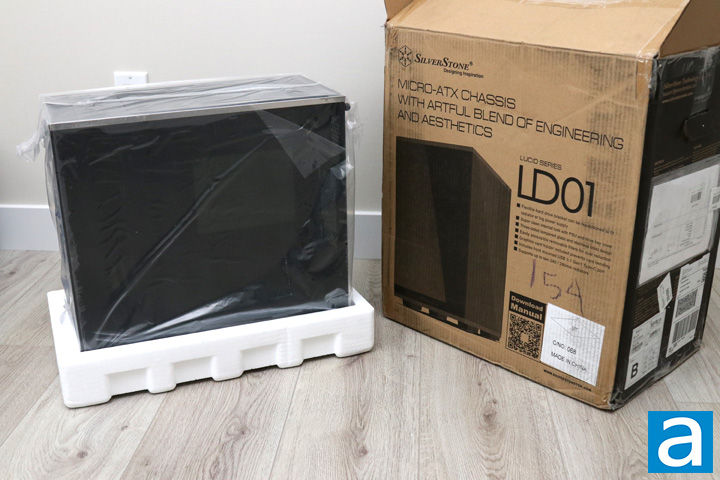 Inside, SilverStone has wrapped the Lucid LD01 in a clear plastic bag to prevent any surface scratches to the case. The whole thing is also surrounded by two foam brackets to prevent more serious damage when the case is being shipped. With a case this heavy and made with lots of glass, thick packaging is important. Thankfully, nothing was damaged in shipping. The glass panels are also wrapped with plastic to prevent any scratches on these sides. Otherwise, a small box can be found in the hard drive tray containing all of the necessary accessories to install your system into the case.