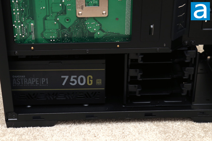 As usual, I started out by installing the power supply in the basement and routing all the necessary cables to the expected spots. As some things are a bit different with the inverted layout on the SilverStone Lucid LD01, it did take a bit more time. As you can see, with the hard drive cage installed in the current position, you will need to be conscientious about how you store your additional cable lengths. I ended up using the large routing area at the front, but that will depend on your cable units and things. As for power supplies, you can install up to a 220mm length unit with some movement of the drive cage. Keep in mind, this will affect your front cooling options too. My GAMDIAS ASTRAPE P1 750G unit is a bit of a longer one at 165mm, so I ended up moving the drive cage after the picture was taken. As for routing its cables, I was actually pleasantly surprised at the sufficient number of openings to plug everything in. Between the side holes or the one at the bottom, I was able to plug everything in without exposing too much cable.