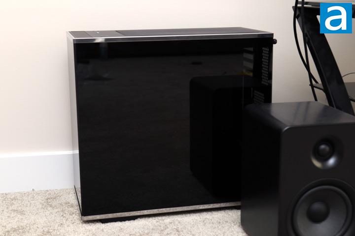 With my system installed and everything plugged in, I fired up the computer for the first time, and everything came to life. With its dark tint, it is practically impossible to see the system inside, unless you throw in some bright LEDs. According to the standard APH Networks sound scale, where 0 is silence and 10 is loud, the SilverStone Lucid LD01 is a 0/10, since it does not come with any stock fans installed. I personally found this case to be adequate in keeping the noise in, but I have heard better sound reducing cases. Obviously, that is not the intent of this case, so you can take it as it is. I still personally would rather have seen some fans included here, at least for added value. The fans SilverStone usually include with their cases are retail-grade, so it would have been nice to see them here. Otherwise, the build looks as clean as always and fits well in my living room setup.