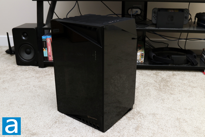 As we mentioned in the introduction, the SilverStone Lucid LD03-AF is a refinement of the original Lucid LD03 with a few improvements around the case. However, the design and shape of the chassis has not changed. As such, we have a three-sided glass exterior, while the fourth side is part of the metal frame of the case. The two glass panels have the same flair with their sloping top and bottom edges to make for a trapezoid panel. The front panel has a bit more plastic, but it shares the same sloping look. Overall, the case is not exactly symmetrical, though the two side panels have the same slope direction. Overall, SilverStone has not changed a whole lot with this design, but that is not too surprising considering this shares the same name with the original. The top part shows some ventilation, as we will see later on. The top also slopes slightly in to create a notable gap between the two side panels. Overall, I think the Lucid LD03-AF still stands out when we compare it to other tower-style mini ITX cases for its fully black exterior and glass panels.