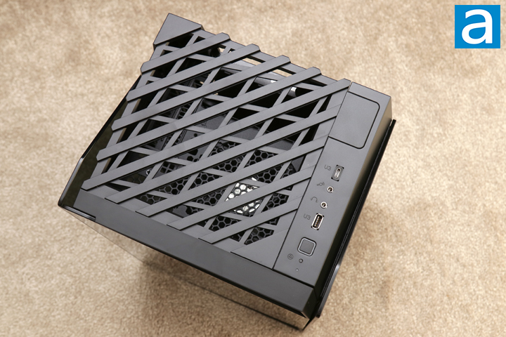 The top panel of the SilverStone Lucid LD03-AF looks mostly familiar, though there were some updates here. The majority of this panel here is made up of a hatched pattern, which should not inhibit airflow from passing out here. Due to the layout of the case, we have a stacked chimney-like design, which means the top is where the air exhausts out of the case. Even though air is blowing out the top, I still think SilverStone could have put some sort of mesh here to prevent dust from entering through the top. On the right side of this picture, you can see all of the I/O you would expect at the front. The one change here is that SilverStone has swapped out one of their USB 3.1 Type-A ports for a Type-C port instead. You can see that the opening is still a square cutout with the newer Type-C port retrofitted. It would have been nice to see two USB 3.1 Type-A ports here in addition to the Type-C, but this is a compromise. Otherwise, we have the same microphone and headphone jack. Towards the corner, we have a square power button surrounded by translucent area that illuminates blue when the computer is powered up. Under that, we have a smaller reset button and a final blue LED to be used for hard drive activity. Otherwise, there is the same rectangular cutout on the top to let you run cables through here.