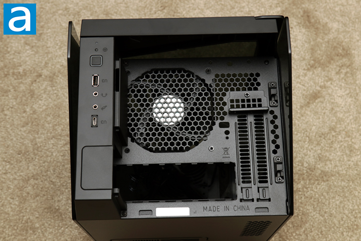 To remove the plastic top, you can push down two tabs at the back and slide the whole piece off. This reveals the top pane, which is really the "back" of the case since all the cables route out here. As you can see, we have a motherboard cutout near the backside of the case. A honeycomb cutout area is where you can see the already mounted exhaust fan. There are two expansion card slots on the panel to let you install a single dual-slot card. As I mentioned a paragraph back, the cutout area pops out to allow users to plug their power cable through here. Otherwise, a large engraved "Made in China" mark can be found on this panel, just in case users forgot where this case was made.