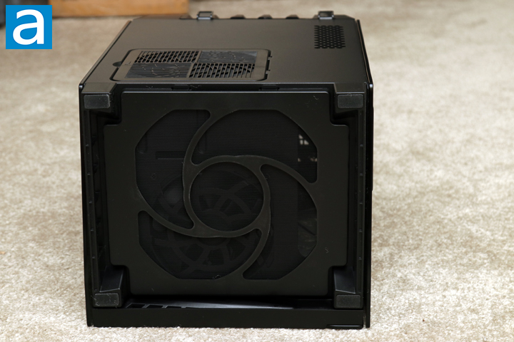 On the bottom of the SilverStone Lucid LD03-AF, we have a raised foot in each corner to lift the case off the surface. Each foot is padded with a rubber lining to prevent vibrations between the case and the flat surface the system may sit on. The rest of the base is a large opening with another plastic frame and mesh area. Once again, this prevents dust from entering at this point, because the base is the intake area of the Lucid LD03-AF. This plastic frame is also easy to remove to keep clean of accumulated dust. This follows the chimney flow design that SilverStone has implemented in this case.