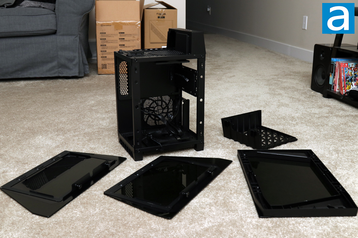 If you listen to the yellow stickers on the side panels, you will know that removing the side panels is quite easy. The first step is to pop off the front panel that is held on by plastic tabs. These tabs are pretty loose but the panel does not fall off unintentionally. Next, you can remove each side panel with two button tabs. Pulling them off will release the tempered glass sides. Each side has a metal frame attached to where the push-pull plastic buttons exist. I still really like how well built this mechanism is, as it does securely hold the sides well. Once released, the rest of the frame slides off. As this is a glass panel, do take care since nothing else is holding the panel to the side. I commend SilverStone for implementing such a simple but functional mechanism to hold the sides in place. It stays hidden so that we get four flat sides without any out-of-place protrusions. As for the glass, they are heavily tinted so it will conceal the components inside, even if you have some illuminated components.