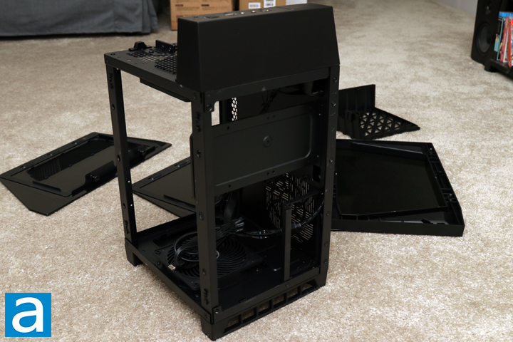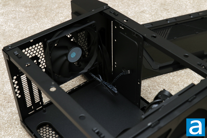 As I have mentioned already in this review, and of the original Lucid LD03, this case has a rotated internal layout to allow air to rise in a chimney effect. This means air comes in at the bottom of the case, moves through the components, and is exhausted out the top. There still is an open area design internally with all of the components installed here. This is not surprising considering the size of the case. Form this point of view, we are looking at the top of the case. A mini ITX or mini DTX case would mount near the top of the case with an expansion card being screwed in here. Four motherboard standoffs are already installed, so you can immediately place the motherboard here. A Silverstone-branded 120mm HA1225L fan is included here for exhaust. This is a 3-pin voltage-controlled fan made by Hong Hua. It runs at 1200RPM under standard operation.