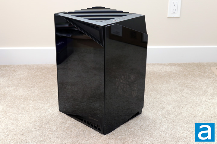 It is not often we see a new shape of chassis, but I am not surprised this is from SilverStone. From the beginning, you can see the Lucid LD03 may be in the same lineup as the Lucid LD01, but it definitely takes on a different style. While both of these feature a majority glass exterior, the Lucid LD03 has cut down on its depth. This LD03 also may not have as much visible metal on the frame of this case, but I can assure you that it is there. Three glass panels make up the front and sides with some flair added by sloping top and bottom edges in a trapezoidal-like fashion. The front panel is framed with a bit more plastic, but it shares the same sloping design. Interestingly, this makes the case asymmetrical, which is not common for cases in 2019. SilverStone keeps the branding to a minimum with just a logo and name at the bottom right side of the front panel. The top part shows some ventilation area as we will see later on. It also slopes slightly inward to create a gap between both the left and right-side panels. Overall, I think all of these elements make for a case that stands out from the rest without trying too hard.