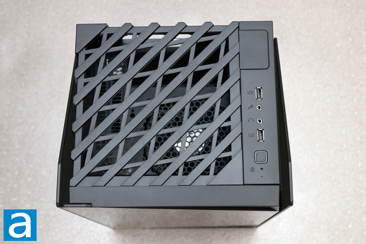 The top panel of the SilverStone Lucid LD03 brings some familiar items as well as some lesser expected ones. Majority of the panel here is made up of a hatched pattern to allow for maximum airflow. Due to the layout of the case, we actually have a stacked chimney-like design, so the top is where the air is expected to leave the enclosure. As such, we have as many holes as possible to let air flow out. I still would have liked to see a mesh pattern on the plastic frame to prevent air from settling inside the case. On the right side, we have all of the I/O you would expect. This includes two USB 3.0 ports, surrounding a microphone and headphone jack. Underneath, we have a square power button surrounded by a blue LED for power status, a pinhole reset switch, and a blue circle LED for the hard drive activity light. With the pricing of this case, I think users should expect a USB Type-C header exposed here at the top. You may notice at the top we have a rectangular cutout that can be actually removed. This is to allow for cables to run through here, as you will see shortly.