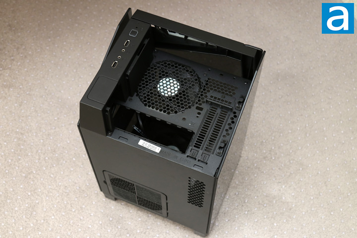 Removing the plastic top on the SilverStone Lucid LD03 requires users to push down on two tabs at the back and slide the shell off. This reveals what would be the "back" of the case in terms of what is normally here. As you can see, we have a motherboard cutout at the back of the case. A honeycomb cutout area is where you can see the exhaust fan area. There are two expansion card slots on this panel to let you install a single dual-slot card here. Finally, the rectangular cutout that I mentioned previously covers up the power plug area, so users could remove the aforementioned cutout to route the power cable here.