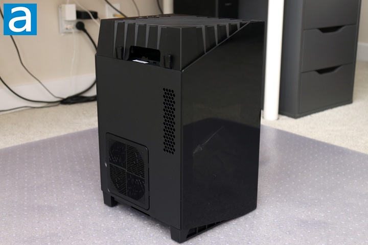 From the other side of the SilverStone Lucid LD03, you can see there is not a whole lot else to speak of. You can see we have a similarly cut tempered glass side panel. At the very back of the case, we have two ventilation areas. The one nearer to the side is located where you would normally slot an expansion card such as a video card. Since graphics cards specifically generate a lot of heat and we are still in a smaller case, it is good to see some extra ventilation here. Underneath, we have a square ventilation area where you can find a plastic frame on top of the steel body. This plastic frame holds a fine mesh to keep dust from entering in this area. In addition, behind this ventilation spot is where users can mount their power supply, which would explain this opening.