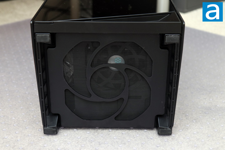 At the very bottom, we have a few things to note. In each corner, we have an extended foot to raise the SilverStone Lucid LD03 off the ground. Each foot is padded with a rubber lining to prevent vibrations between the case and any hard surface it sits on. In the middle we have a massive opening with another plastic frame and mesh area. Once again, this prevents dust from entering here because this is actually the intake area of the SilverStone Lucid LD03, as we will see when we get inside the case. This plastic frame is easy to remove to keep clean off accumulated dust, which is good to see. Otherwise, it is time to take the glass panels off and peer inside.