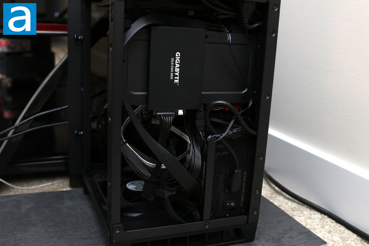 On the Lucid LD03 horizontal drive bracket, I installed a Gigabyte UD PRO 256GB SSD and finished up my cabling. Overall, installation was pretty straightforward. Much like last week's mITX case, the Lucid LD03 does not have too much of a routing space for excess cables, but this side area does provide an area to keep the cables out of the way. I ended up using an included cable tie to wrap all the excess cables together too, which was helpful. SilverStone also provided a fan header splitter for the two included fans, which was helpful. I would have liked to still see some tie points to anchor this excess. Otherwise, I enjoyed building in the Lucid LD03, even if it meant working in smaller spaces.