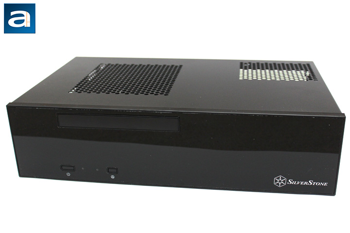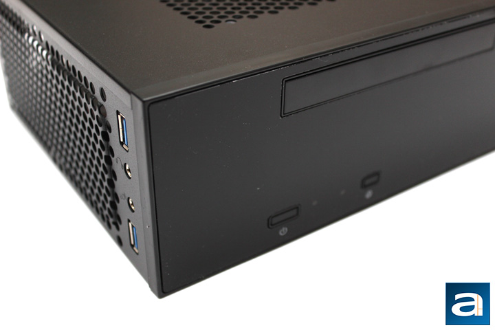 From here, you can also get a pretty clear look of the front panel. At the bottom left we have a larger power button followed by two LEDs and a reset button. The left LED is the power button, while the right one is for hard drive activity. At the top of the left side is a slot for the optical drive, where you can put a slimline 9.5mm drive or a 12.7mm drive into the top. Finally, at the bottom right of the front is the SilverStone logo in white. I would have liked to see a more hidden logo, though this is also in line with other home theater components that show logos on the front. Unlike other cases, there is no air intake at the front of the Milo ML09.