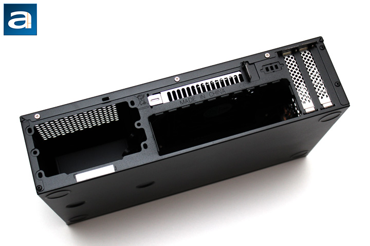 On the top of the case are two openings, again for air holes. Once again these are circular in shape, and allow for air to pass through to the motherboard and power supply. The left ventilation area is located right above the motherboard, and more specifically, right above the processor and its heatsink. The right side is meant to allow air to pass to the SFX power supply, which is quite important considering how small the power supply is. As you saw in the accessories picture on page one, a magnetic filter is provided from the left set of holes, but I would have liked to see the same over the power supply, whether it is magnetic or integrated into the case itself. This would again prevent dust from entering in this area, as the ventilation holes are pretty big.