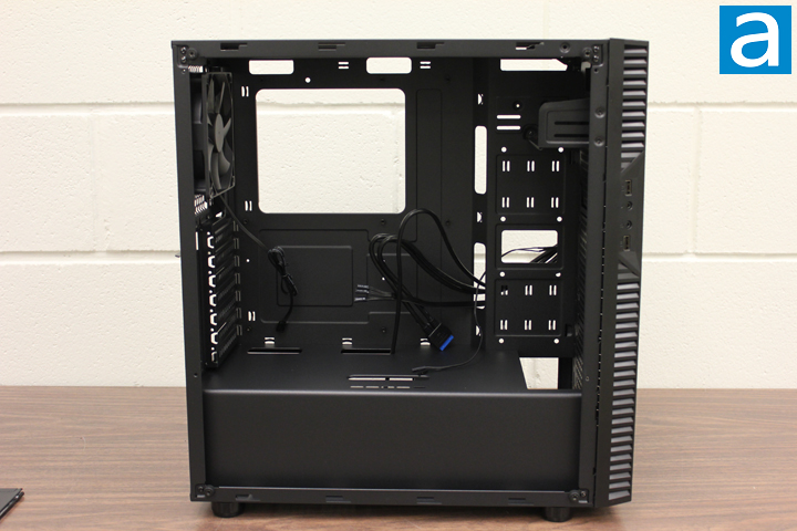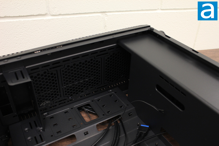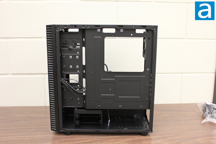 After removing the side panel, you can see the internal design of the SilverStone Precision PS14-E. To be consistent with the exterior, the interior of the case is also painted matte black. The paint is sprayed evenly inside the chassis. At bottom of the case, there is a power supply chamber with no ventilation holes on top. Not only is it designed to shelter the power supply, the chamber is also the place for you to put up to two 3.5" HDDs. The cool air for the power supply chamber can be blown into the case through the dust filter protected ventilation holes at the bottom of the case directly. If your SilverStone Precision PS14-E is fully loaded with fans, graphics cards, and long radiators, cool air can be pumped by the fans of up to 360 mm radiators into the chassis through the air intakes at the front panel, hit the graphics card, and be expelled out through the exhaust grille at the top panel. If the user only plans to use a small radiator or just a CPU heatsink with the top ventilation grille covered, the hot air can be expelled out through the rear exhaust grille on the back panel. A 5.25" drive bay is present in the product, though its low profile nature means it will not obstruct airflow. In addition, it is removable if you are not using it.