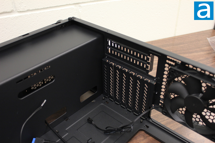 As a mid-tower, the SilverStone Precision PS14-E can support ATX sized motherboards and, of course, smaller boards such as micro ATX and mini ITX. All motherboard risers were screwed on to the tray from the factory. Users do not need to apply the required risers according to the size of motherboard that will be used. After bolting the motherboard into position, the heatsink or water cooler block can then be easily installed and removed, thanks to the big rectangular opening on the tray. From the above photo, you can see there is a 120 mm fan from the factory on the case’s rear exhaust opening. If the user wants to use a closed loop water cooler system, it requires an extra step to install the radiator directly onto the chassis, which is to remove the preinstalled fan. The expansion slot covers of this chassis feature slotted holes to allow better ventilation, but I would prefer for it to be a solid piece for better dust prevention, since I really doubt it makes a significant difference to just have several small holes here.